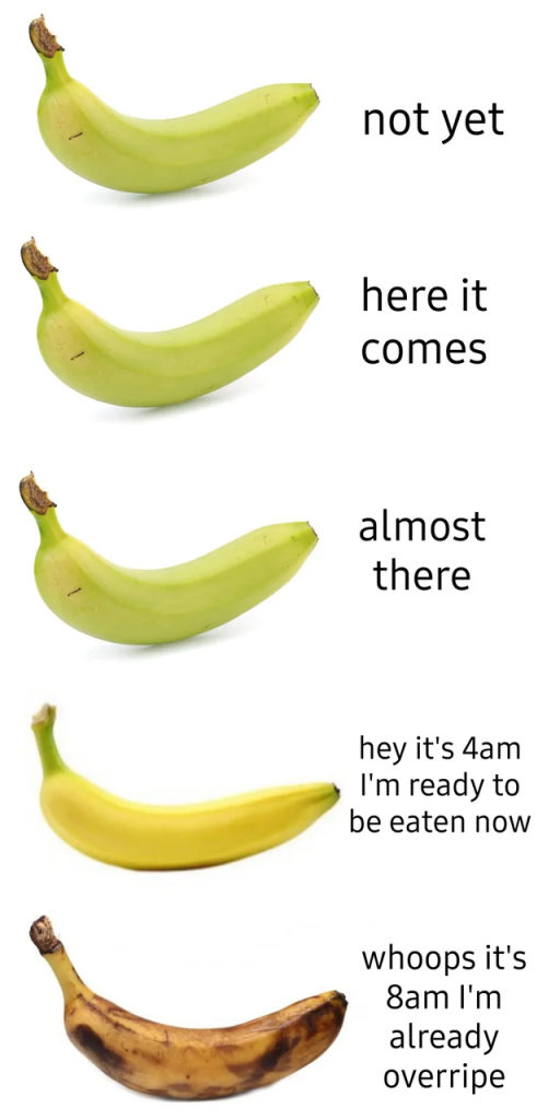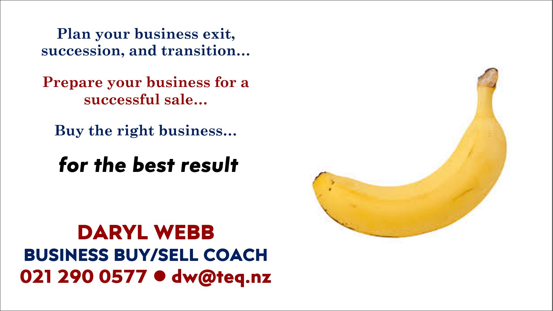 A common tool for presenters at BNI is to have a prop: something physical that the speaker uses to illustrate their message. A (now former) chapter member, Ant Simons of Attain NZ, was the master of the prop, and I was keen to have a shot. My plan was to talk about the oft-discussed issue for business owners: when is the best time to sell their business? I would then have three bananas: One green (obviously unripe), one a perfect yellow, and one ‘overripe’ speckled with numerous brown spots. I would use these props to demonstrate the futility of trying to time the market.
